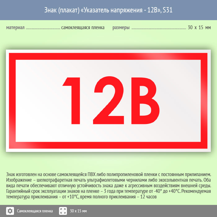 Знак (плакат) «Указатель напряжения 12 В», S31 (50 штук, пленка, 30х15 мм) в Магнитогорске купить