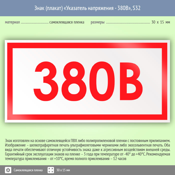 Знак (плакат) «Указатель напряжения - 380В», S32 (50 штук, пленка, 30х15 мм) в Магнитогорске купить