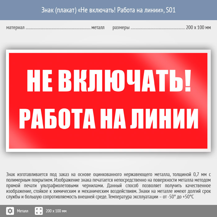 Знак (плакат) «Не включать! Работа на линии», S01 (металл, 200х100 мм) в Магнитогорске купить