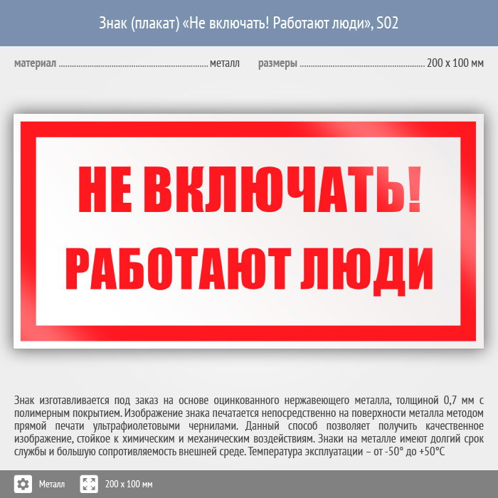 Знак (плакат) «Не включать! Работают люди», S02 (металл, 200х100 мм) в Магнитогорске купить