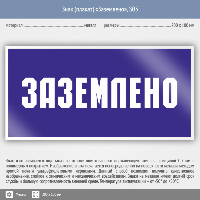Знак (плакат) «Заземлено», S05 (металл, 200х100 мм) в Магнитогорске купить
