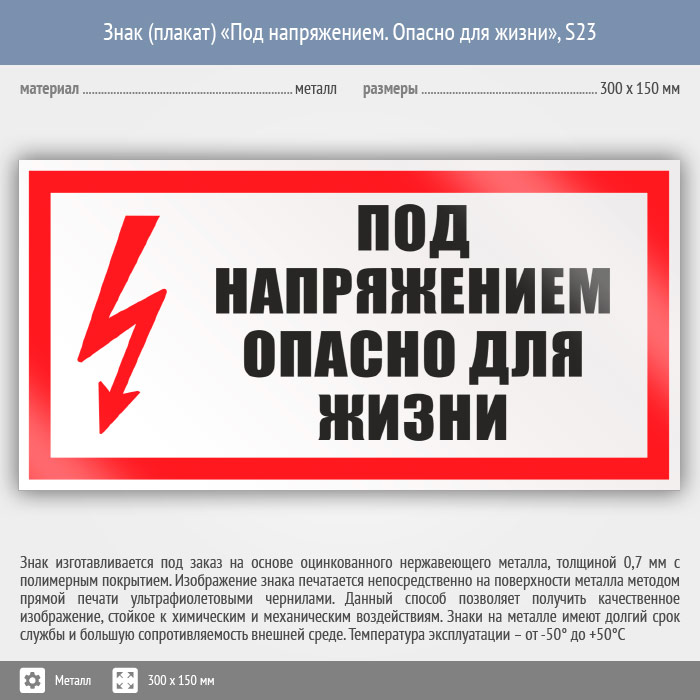 Знак (плакат) «Под напряжением. Опасно для жизни», S23 (металл, 300х150 мм) в Магнитогорске купить