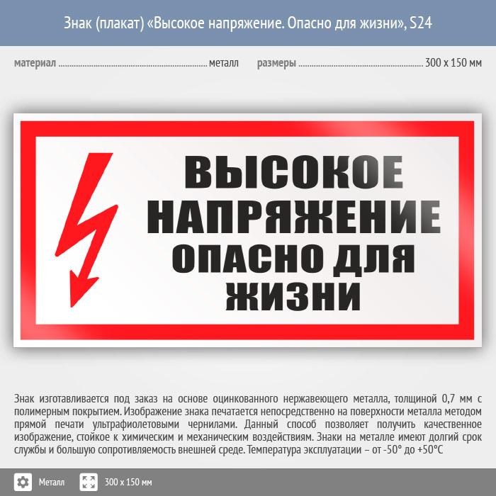 Знак (плакат) «Высокое напряжение. Опасно для жизни», S24 (металл, 300х150 мм) в Магнитогорске купить