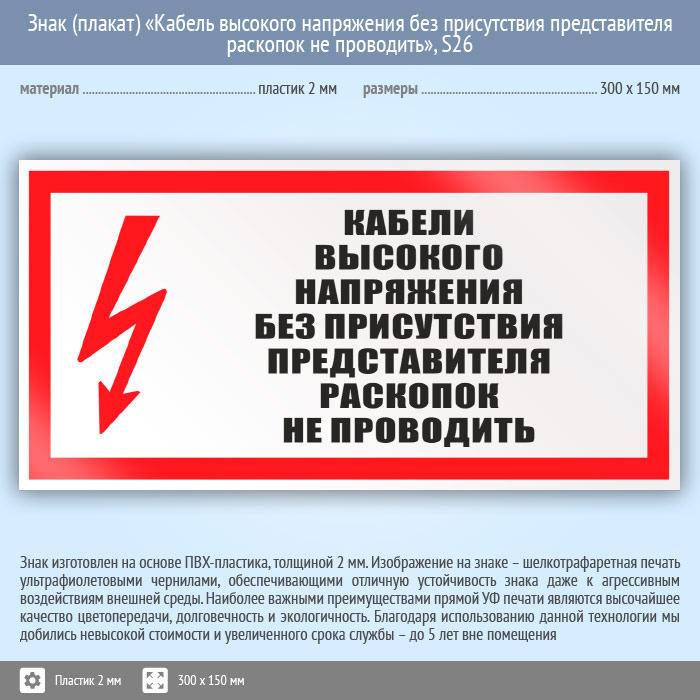 Знак (плакат) «Кабель высокого напряжения без присутствия представителя раскопок не проводить», S26 (пластик, 300х150 мм) в Магнитогорске купить