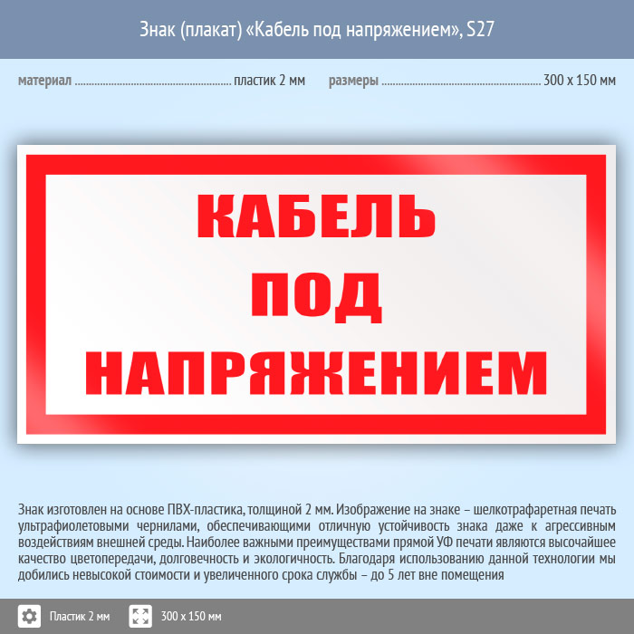 Знак (плакат) «Кабель под напряжением», S27 (пластик, 300х150 мм) в Магнитогорске купить