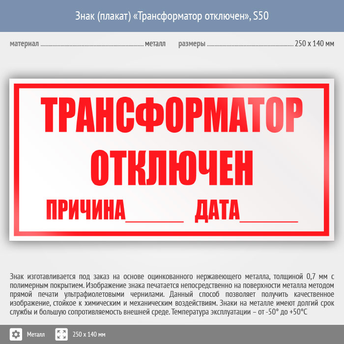 Знак (плакат) «Трансформатор отключен», S50 (металл, 250х140 мм) в Магнитогорске купить