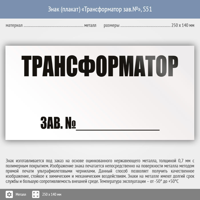 Знак (плакат) «Трансформатор зав.№», S51 (металл, 250х140 мм) в Магнитогорске купить