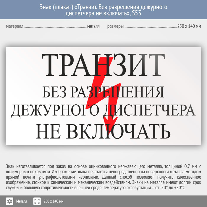 Знак (плакат) «Транзит. Без разрешения дежурного диспетчера Не включать», S53 (металл, 250х140 мм) в Магнитогорске купить