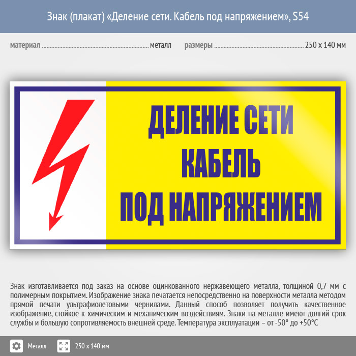 Знак (плакат) «Деление сети. Кабель под напряжением», S54 (металл, 250х140 мм) в Магнитогорске купить