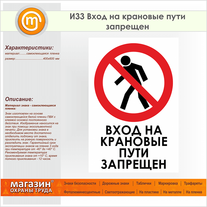 Знак «Вход на крановые пути запрещен», И33 (пленка, 400х600 мм) в Магнитогорске купить