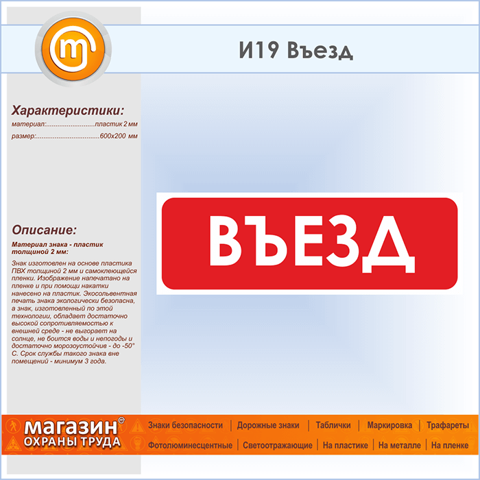 Знак «Въезд», И19 (пластик, 600х200 мм) в Магнитогорске купить