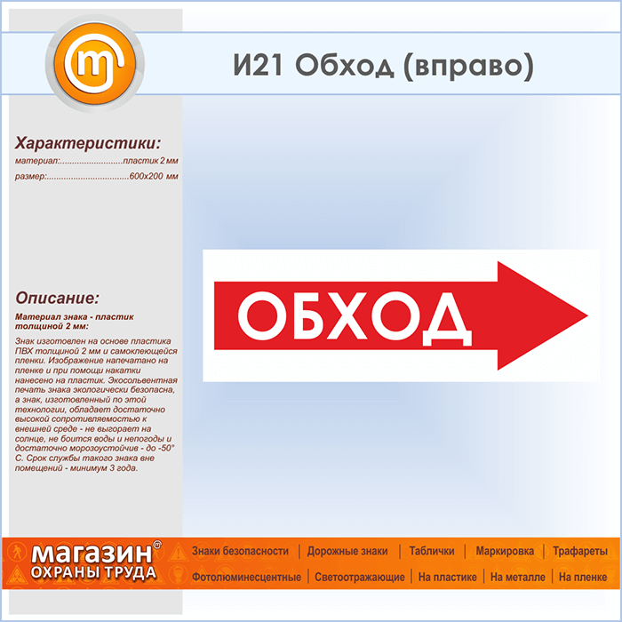 Знак «Обход (вправо)», И21 (пластик, 600х200 мм) в Магнитогорске купить