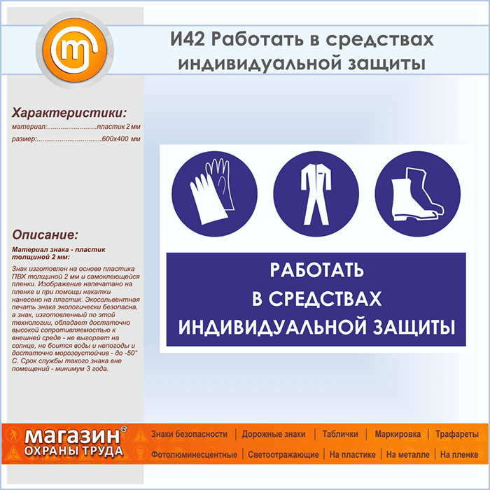 Знак «Работать в средствах индивидуальной защиты», И42 (пластик, 600х400 мм) в Магнитогорске купить