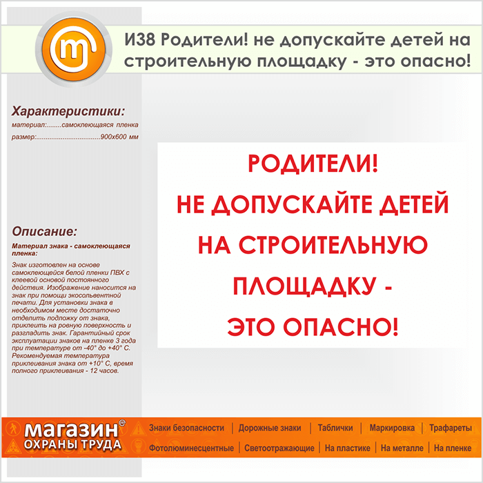 Знак «Родители! не допускайте детей на строительную площадку - это опасно!», И38 (пленка, 900х600 мм) в Магнитогорске купить