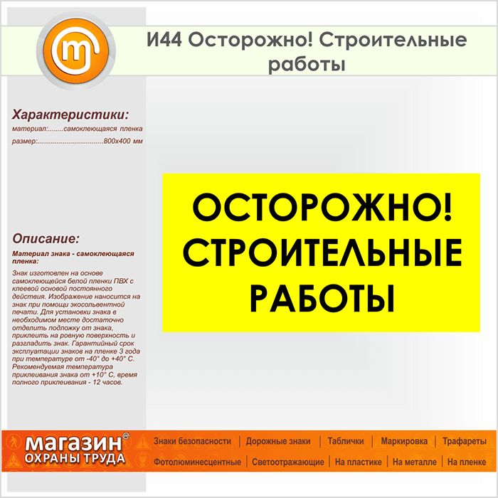 Знак «Осторожно! Строительные работы», И44 (пленка, 800х400 мм) в Магнитогорске купить
