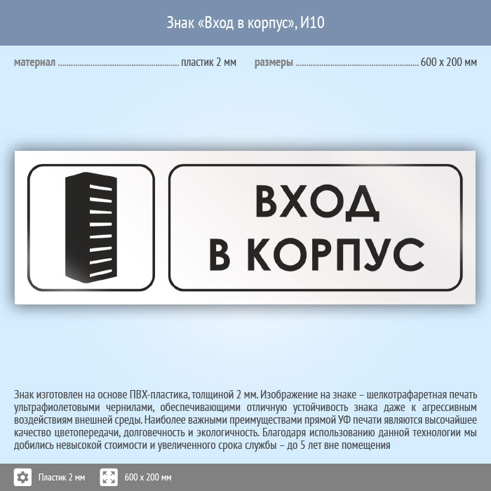 Знак «Вход в корпус», И10 (пластик, 600х200 мм) в Магнитогорске купить