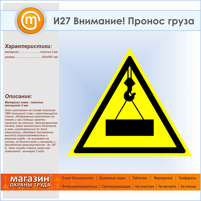Знак «Внимание! Пронос груза», И27 (пластик, сторона 500 мм) в Магнитогорске купить