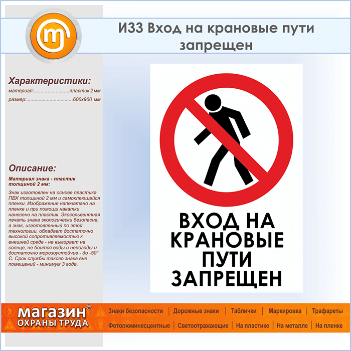 Знак «Вход на крановые пути запрещен», И33 (пластик, 600х900 мм) в Магнитогорске купить