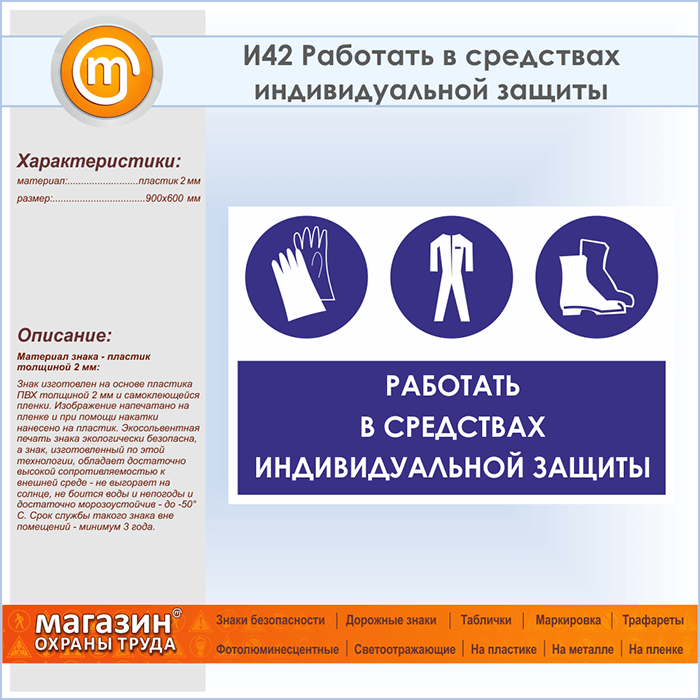 Знак «Работать в средствах индивидуальной защиты», И42 (пластик, 900х600 мм) в Магнитогорске купить