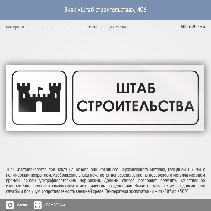 Знак «Штаб строительства», И06 (металл, 600х200 мм) в Магнитогорске купить