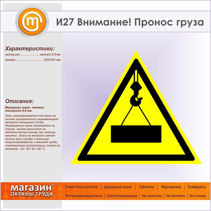 Знак «Внимание! Пронос груза», И27 (металл, сторона 300 мм) в Магнитогорске купить