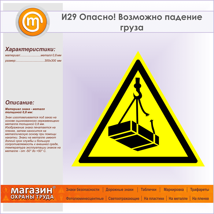 Знак «Опасно! Возможно падение груза», И29 (металл, сторона 300 мм) в Магнитогорске купить