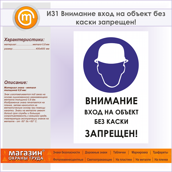 Знак «Внимание вход на объект без каски запрещен!», И31 (металл, 400х600 мм) в Магнитогорске купить