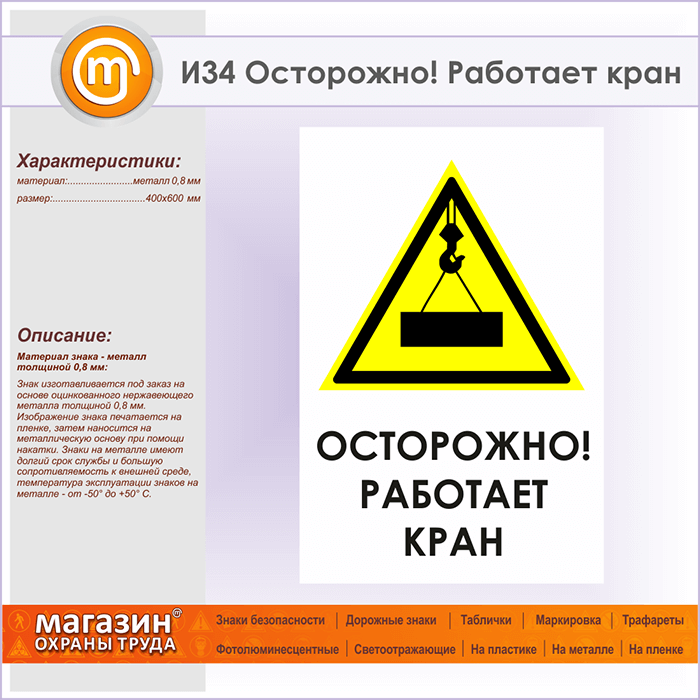 Знак «Осторожно! Работает кран», И34 (металл, 400х600 мм) в Магнитогорске купить
