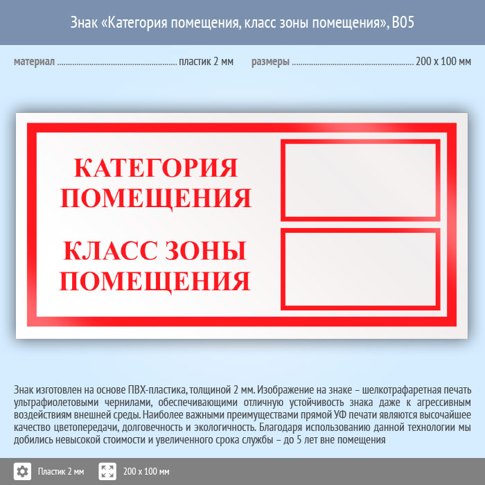 Знак «Категория помещения, класс зоны помещения», B05 (пластик, 200х100 мм) в Магнитогорске купить