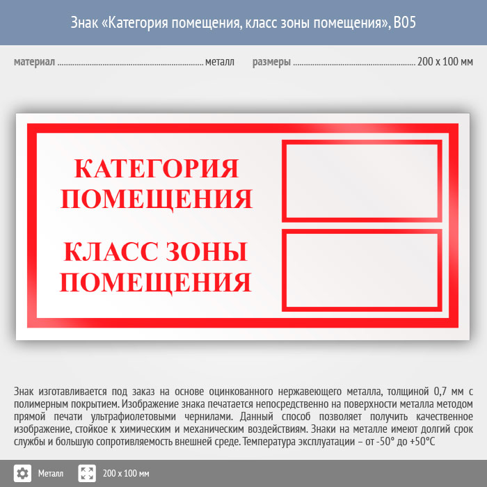 Знак «Категория помещения, класс зоны помещения», B05 (металл, 200х100 мм) в Магнитогорске купить
