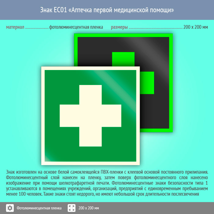 Знак EC01 «Аптечка первой медицинской помощи» (фотолюминесцентная пленка, 200х200 мм) в Магнитогорске купить