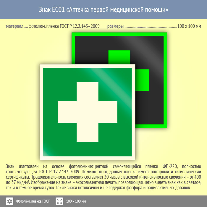 Знак EC01 «Аптечка первой медицинской помощи» (фотолюминесцентная пленка ГОСТ 34428-2018, 100х100 мм) в Магнитогорске купить