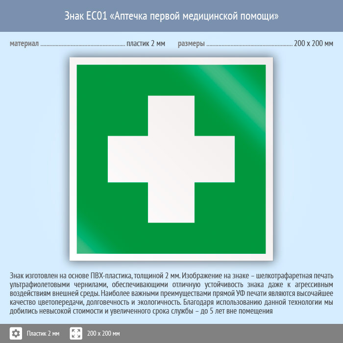 Знак EC01 «Аптечка первой медицинской помощи» (пластик, 200х200 мм) в Магнитогорске купить