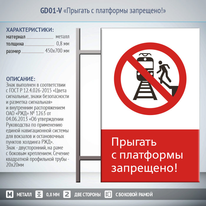 Знак «Прыгать с платформы запрещено!», GD01-V (двусторонний вертикальный, 450х700 мм, металл, на раме с боковым креплением) в Магнитогорске купить