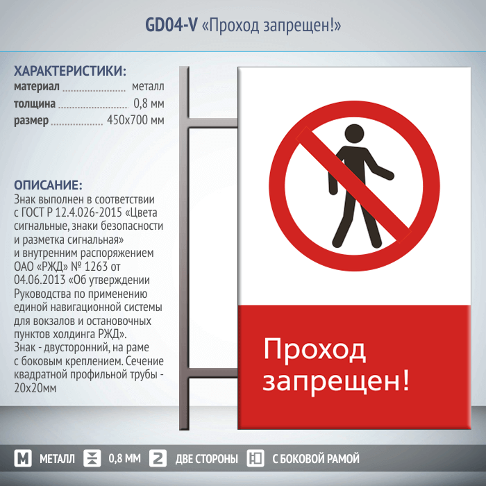 Знак «Проход запрещен!», GD04-V (двусторонний вертикальный, 450х700 мм, металл, на раме с боковым креплением) в Магнитогорске купить