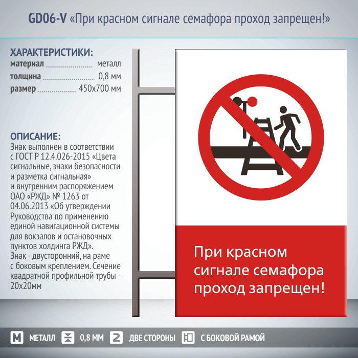 Знак «При красном сигнале семафора проход запрещен!», GD06-V (двусторонний вертикальный, 450х700 мм, металл, на раме с боковым креплением) в Магнитогорске купить