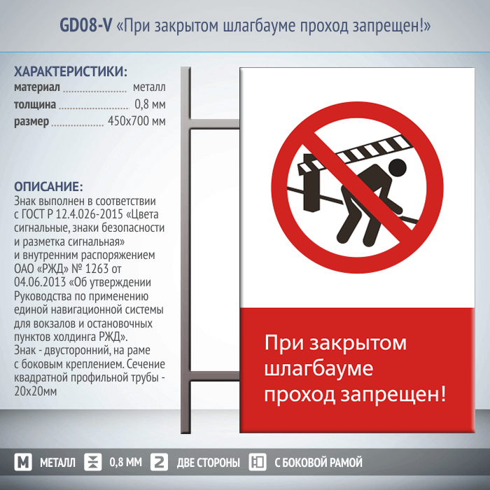 Знак «При закрытом шлагбауме проход запрещен!», GD08-V (двусторонний вертикальный, 450х700 мм, металл, на раме с боковым креплением) в Магнитогорске купить