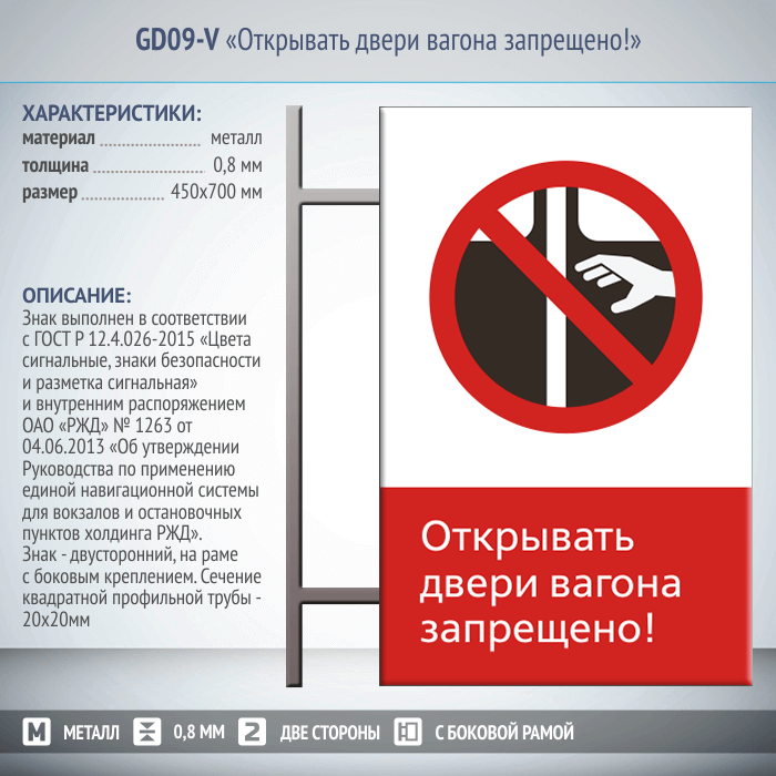 Знак «Открывать двери вагона запрещено!», GD09-V (двусторонний вертикальный, 450х700 мм, металл, на раме с боковым креплением) в Магнитогорске купить
