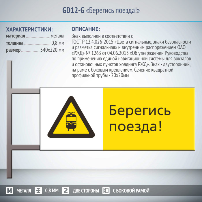 Знак «Берегись поезда!», GD12-G (двусторонний горизонтальный, 540х220 мм, металл, на раме с боковым креплением) в Магнитогорске купить