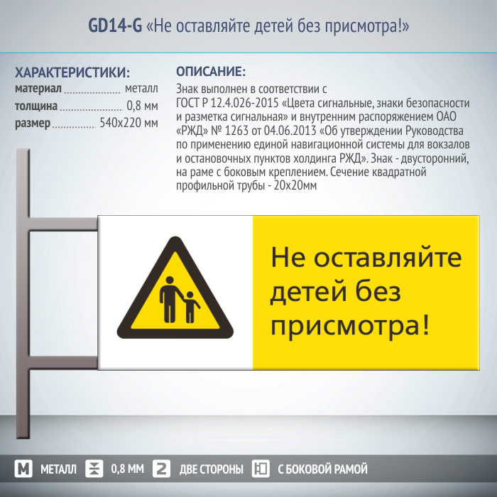Знак «Не оставляйте детей без присмотра!», GD14-G (двусторонний горизонтальный, 540х220 мм, металл, на раме с боковым креплением) в Магнитогорске купить
