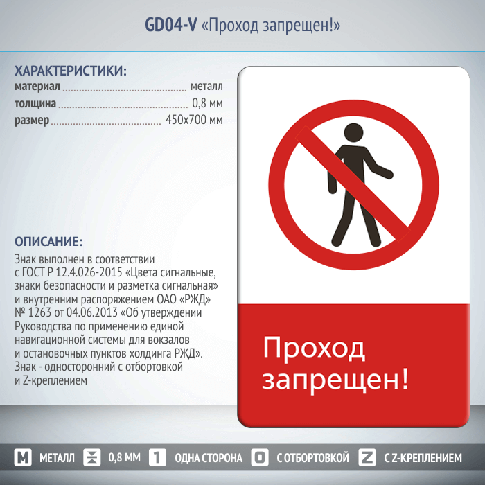 Знак «Проход запрещен!», GD04-V (односторонний вертикальный, 450х700 мм, металл, с отбортовкой и Z-креплением) в Магнитогорске купить