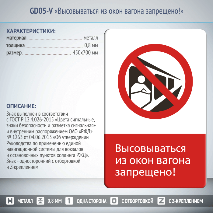 Знак «Высовываться из окон вагона запрещено!», GD05-V (односторонний вертикальный, 450х700 мм, металл, с отбортовкой и Z-креплением) в Магнитогорске купить