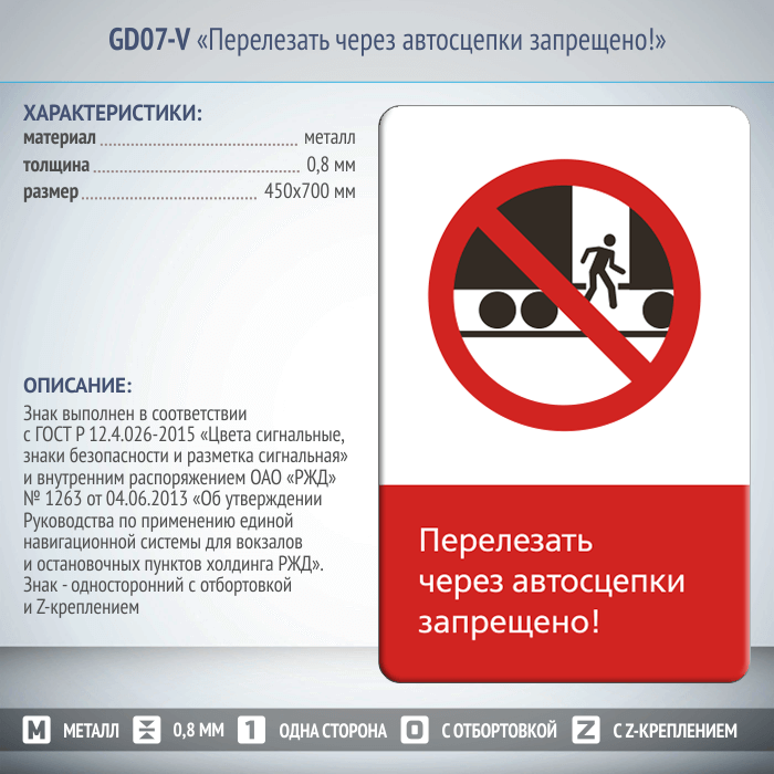 Знак «Перелезать через автосцепки запрещено!», GD07-V (односторонний вертикальный, 450х700 мм, металл, с отбортовкой и Z-креплением) в Магнитогорске купить