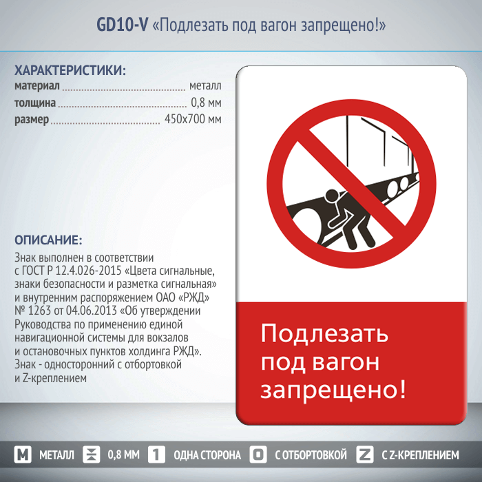 Знак «Подлезать под вагон запрещено!», GD10-V (односторонний вертикальный, 450х700 мм, металл, с отбортовкой и Z-креплением) в Магнитогорске купить