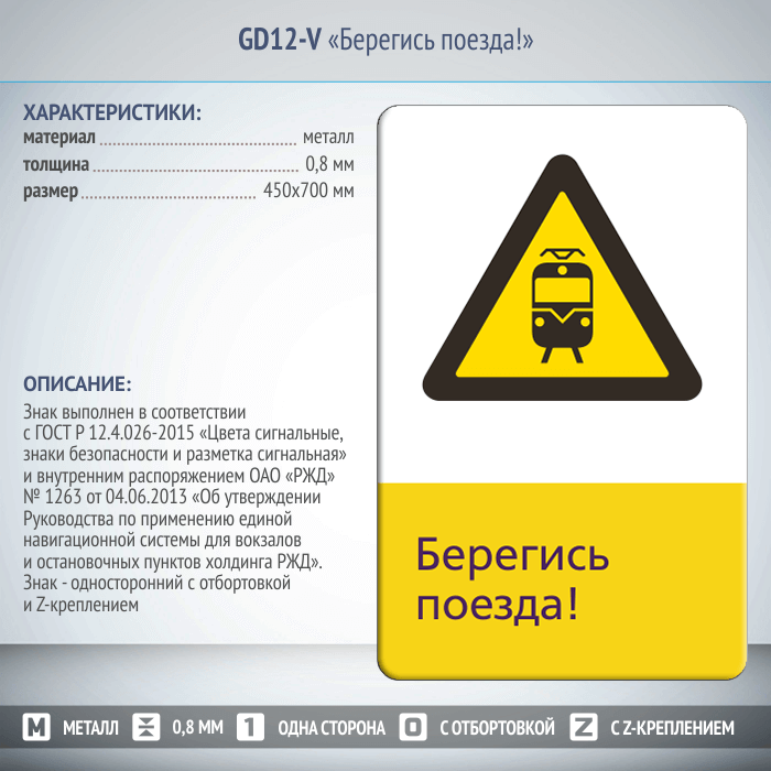 Знак «Берегись поезда!», GD12-V (односторонний вертикальный, 450х700 мм, металл, с отбортовкой и Z-креплением) в Магнитогорске купить