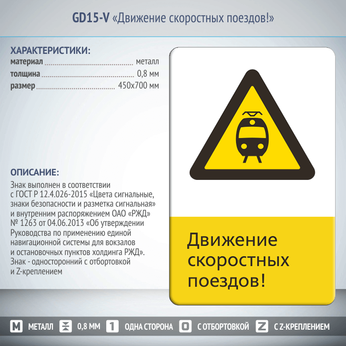Знак «Движение скоростных поездов!», GD15-V (односторонний вертикальный, 450х700 мм, металл, с отбортовкой и Z-креплением) в Магнитогорске купить