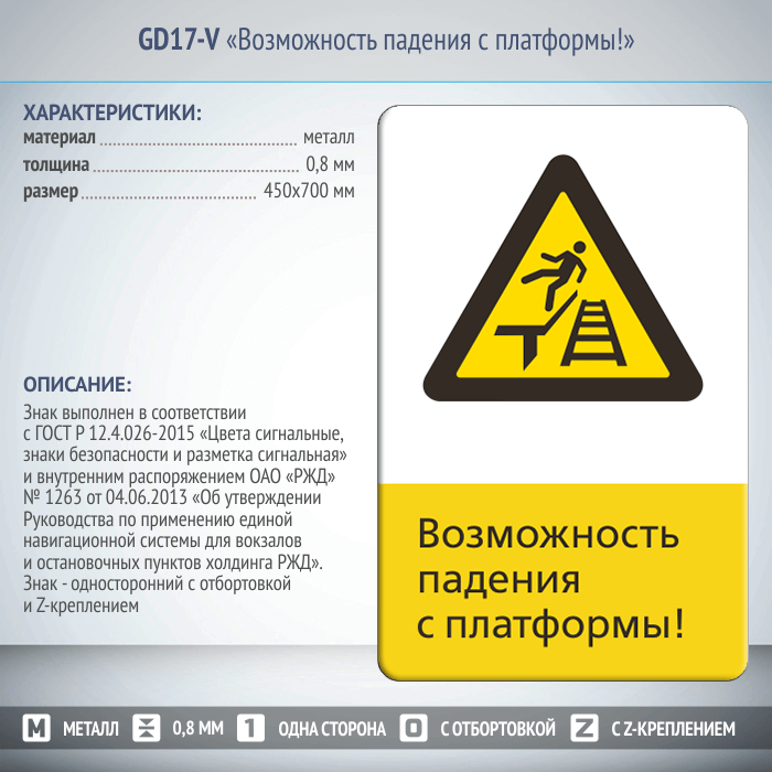 Знак «Возможность падения с платформы!», GD17-V (односторонний вертикальный, 450х700 мм, металл, с отбортовкой и Z-креплением) в Магнитогорске купить