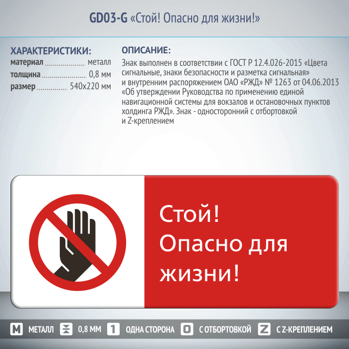 Знак «Стой! Опасно для жизни!», GD03-G (односторонний горизонтальный, 540х220 мм, металл, с отбортовкой и Z-креплением) в Магнитогорске купить