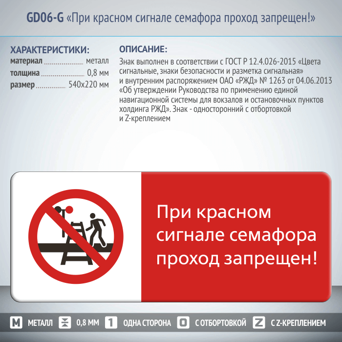 Знак «При красном сигнале семафора проход запрещен!», GD06-G (односторонний горизонтальный, 540х220 мм, металл, с отбортовкой и Z-креплением) в Магнитогорске купить