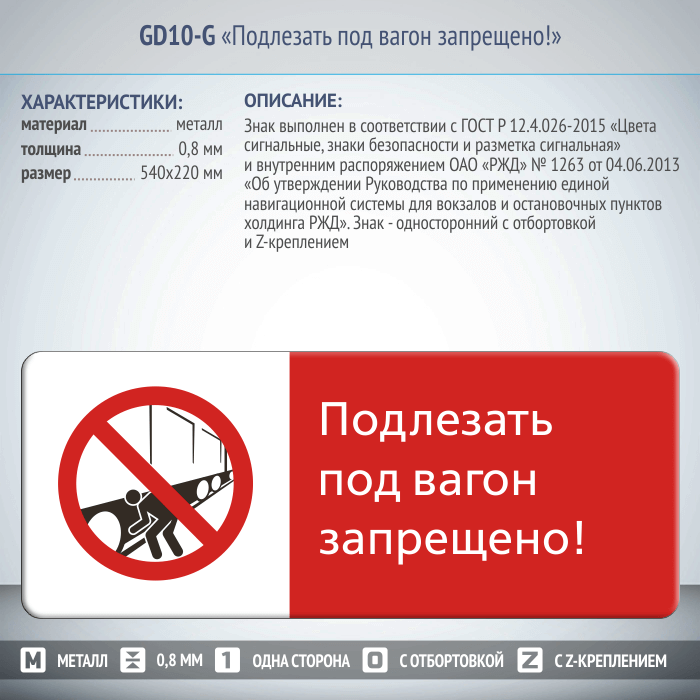 Знак «Подлезать под вагон запрещено!», GD10-G (односторонний горизонтальный, 540х220 мм, металл, с отбортовкой и Z-креплением) в Магнитогорске купить